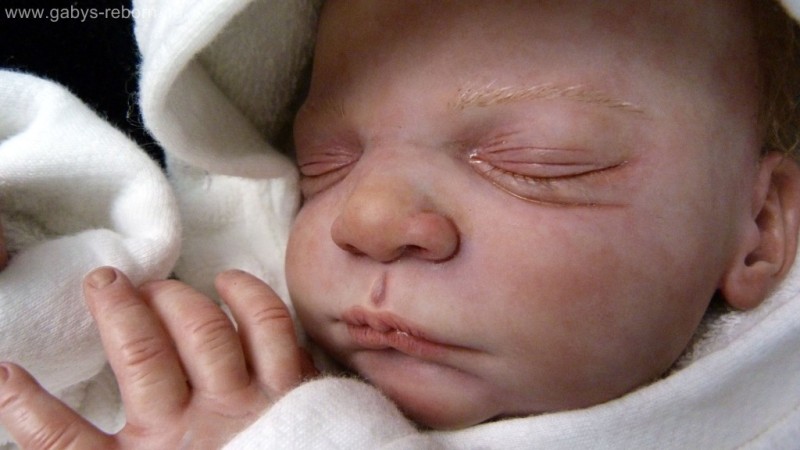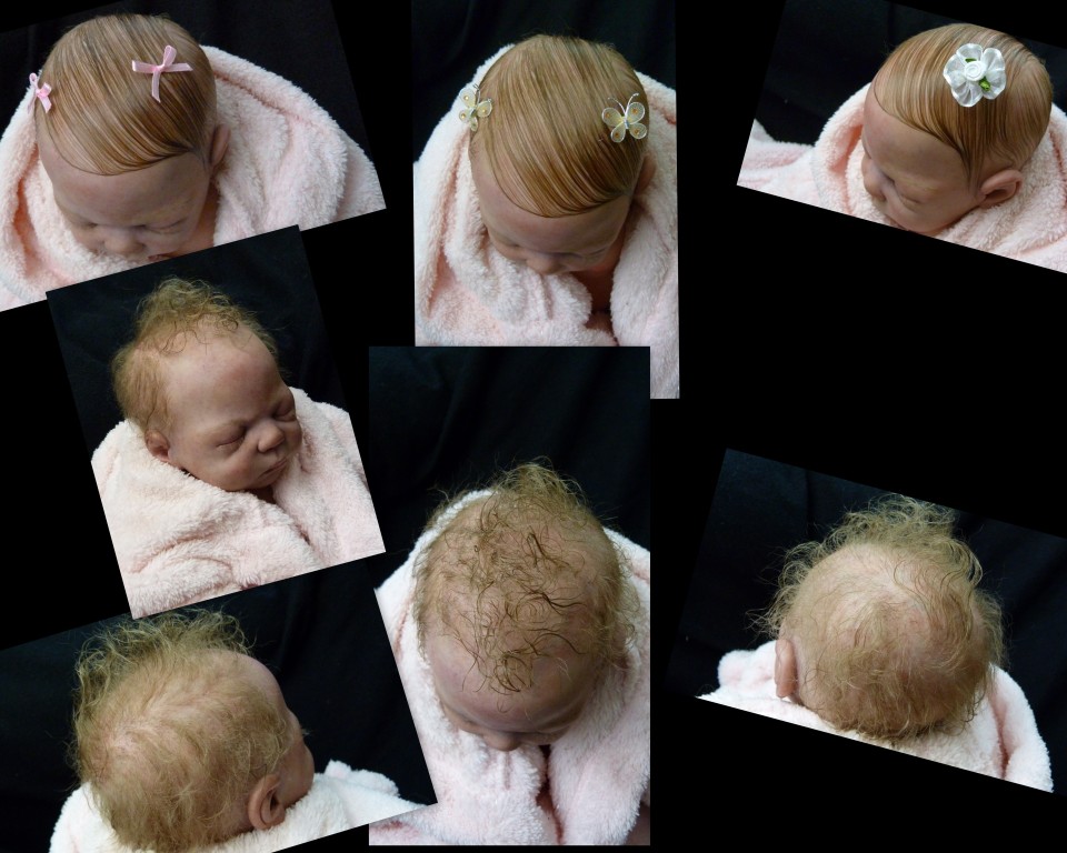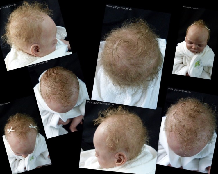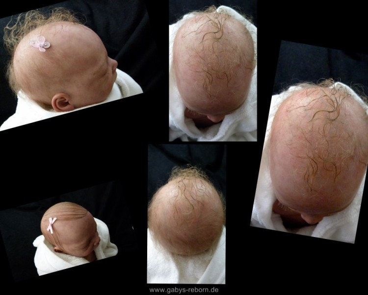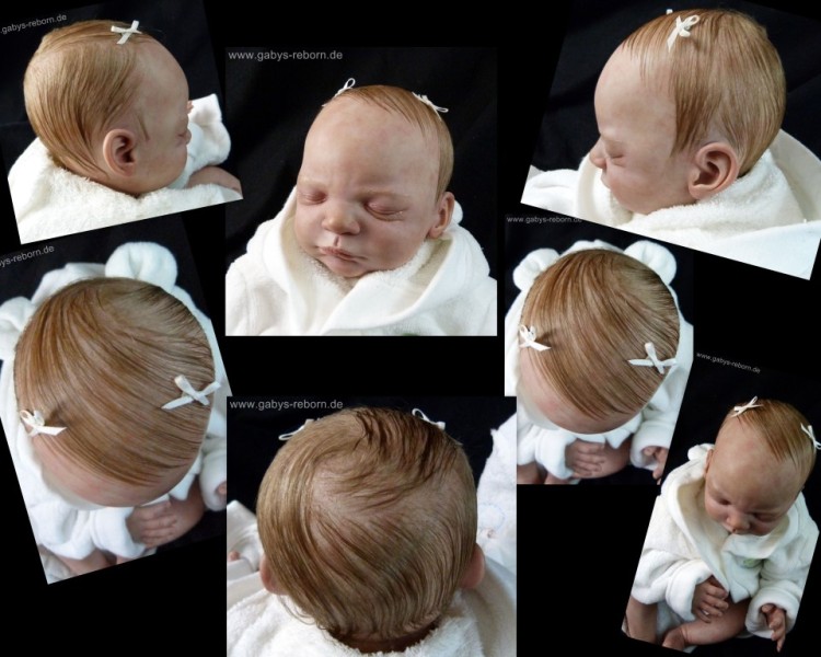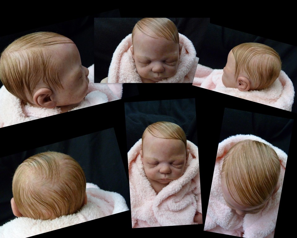 Die Babys bekommen gerootete Augenwimpern, gezeichnete bzw. gerootete Augenbrauen (microrooting), geöffnete Nasen & Ohren sowie mit Modelliermasse Nasen bzw. Ohrengänge modelliert, Ich färbe mit Genesis Heat Paints in vielen Schichten und anschließender Versiegelung.