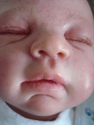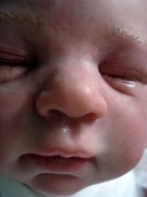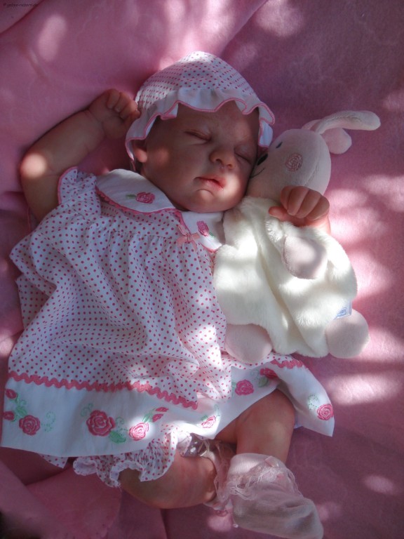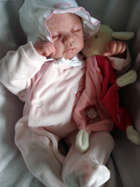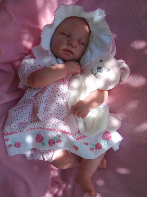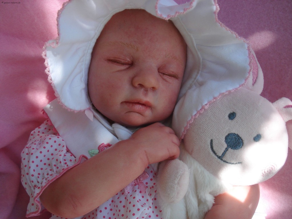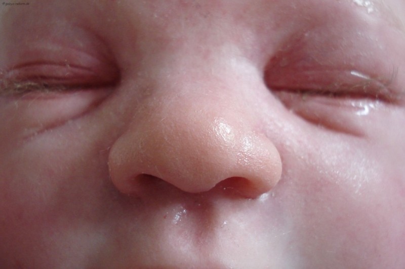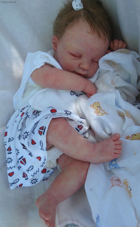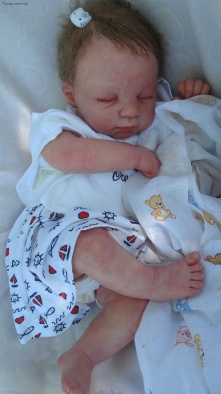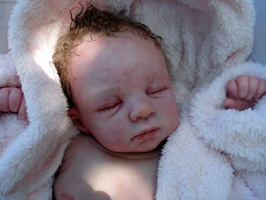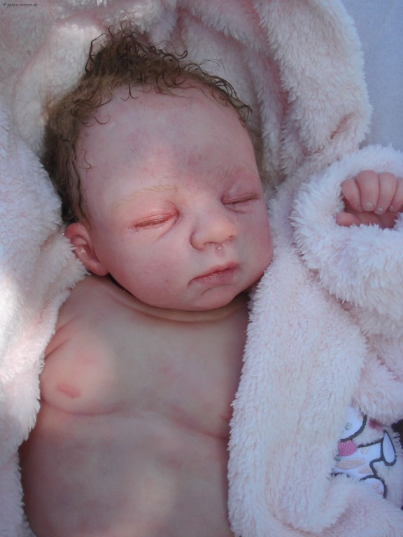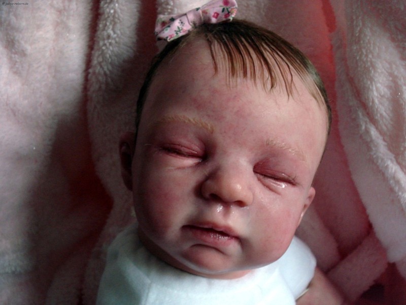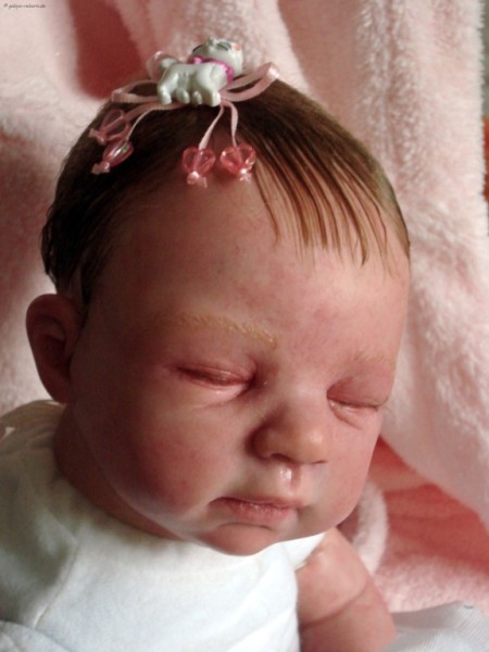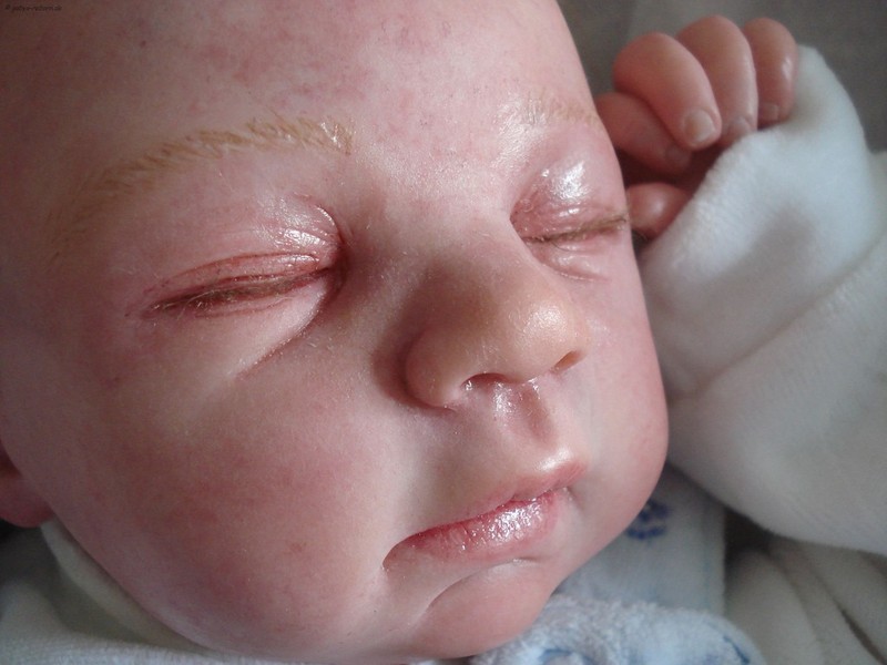 Die Babys bekommen gerootete Augenwimpern, gezeichnete bzw. gerootete Augenbrauen (microrooting), geöffnete Nasen & Ohren sowie mit Modelliermasse Nasen bzw. Ohrengänge modelliert, Ich färbe mit Genesis Heat Paints in vielen Schichten und anschließender Versiegelung.