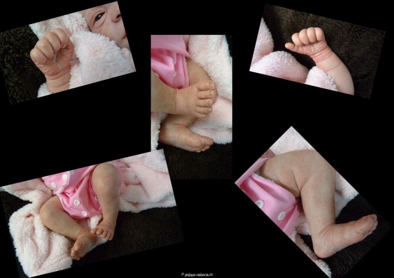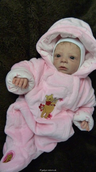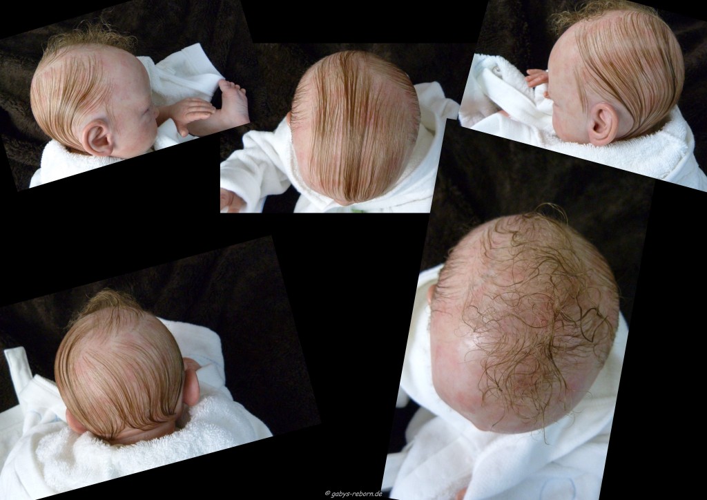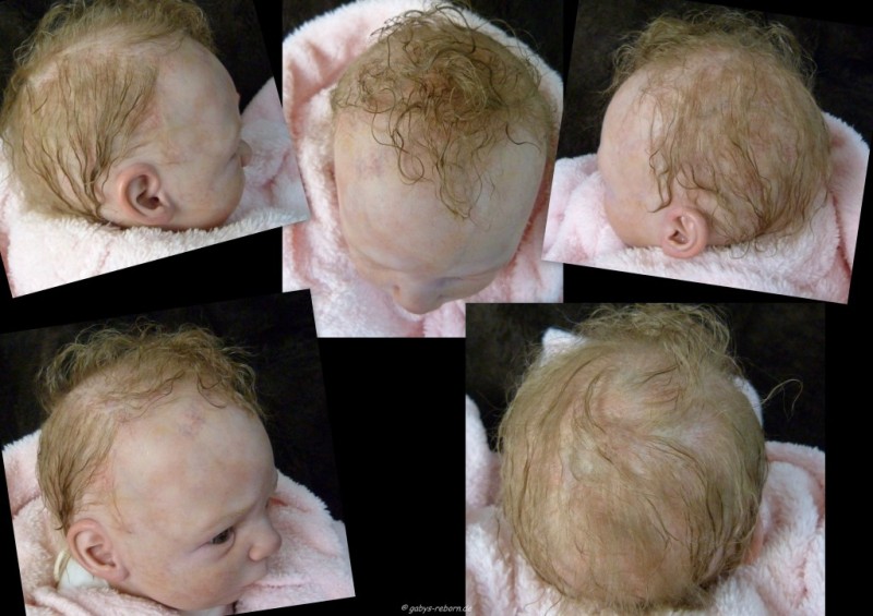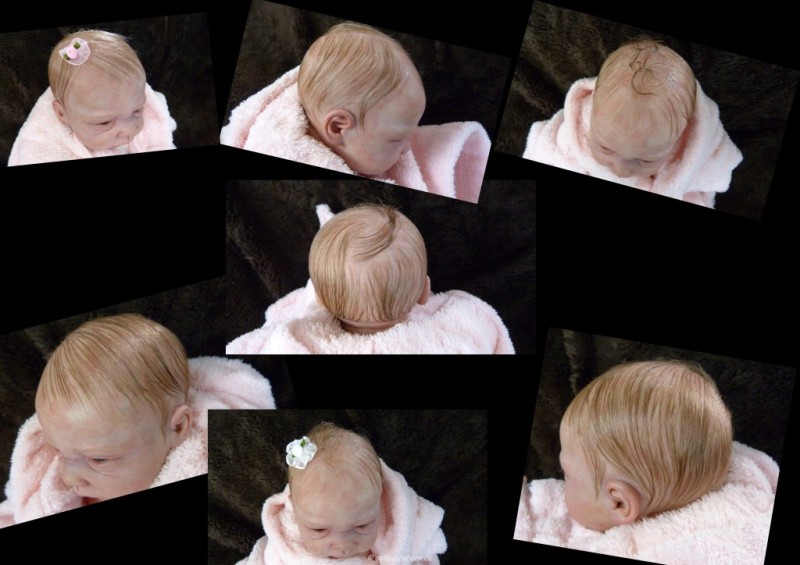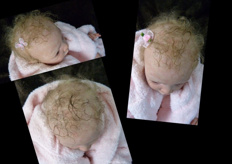 Die Babys bekommen gerootete Augenwimpern, gezeichnete bzw. gerootete Augenbrauen (microrooting), geöffnete Nasen & Ohren sowie mit Modelliermasse Nasen bzw. Ohrengänge modelliert, Ich färbe mit Genesis Heat Paints in vielen Schichten und anschließender Versiegelung.