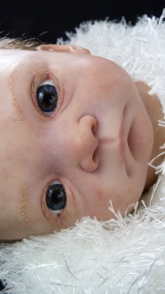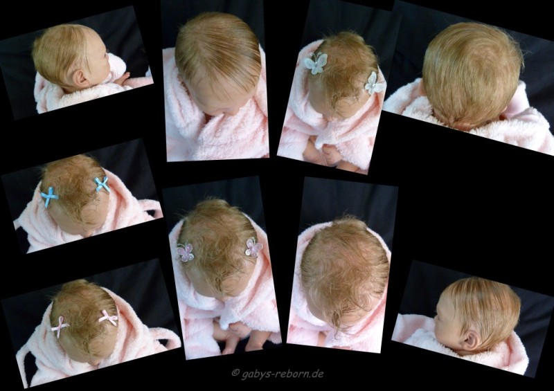 Die Haare (mehrfarbig-mittelbraun / dunkelbraun) sind aus Premium Mohair ( von innen versiegelt) microrooting (46 Nadel) mit Wirbel am Hinterkopf gearbeitet. Ihre Augenwimpern sind ebenfalls gerootet.